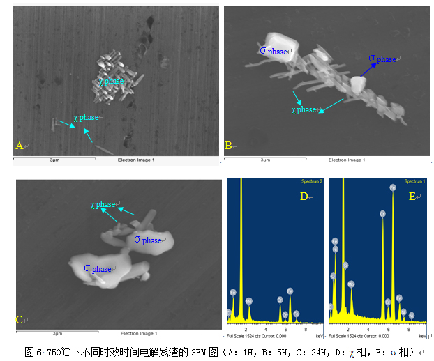 圖5是試樣在750 ℃時(shí)效不同時(shí)間電解殘雜的XRD圖譜,反映了在同一時(shí)效溫度下,隨著時(shí)間的延長(zhǎng),析出相的形成和變化。在時(shí)效1 h后,析出相主要是以M23C6和Cr2N為主,并有少量的χ相;到2 h,χ相開(kāi)始增多;5 h以后則有部分σ相出現(xiàn),而后伴隨著時(shí)間的延長(zhǎng),σ相越來(lái)越多,相應(yīng)χ相開(kāi)始減少,到24 h時(shí),σ相已經(jīng)占主導(dǎo)地位,且形成的晶體很完整,XRD圖譜峰和清晰明顯。該過(guò)程可以描述為:M23C6,Cr2N,χ相→χ相,Cr2N,M23C6→χ相,Cr2N,σ相→σ相,χ相。M23C6的析出導(dǎo)致相界附近的鐵素體相內(nèi)鉻的損失,鐵素體內(nèi)的貧鉻促進(jìn)原始α/γ相界向鐵素體晶內(nèi)遷移,釋放出多余的鉻給鄰近的鐵素體相,為金屬間相形核創(chuàng)造了條件[11-12]。圖6是 750 ℃下不同時(shí)效時(shí)間電解殘?jiān)腟EM觀測(cè),通過(guò)能譜分析可知,圖中針狀(刺狀)的部分主要是含F(xiàn)e, Cr, Mo,不含Ni;而塊狀的部分主要含F(xiàn)e, Cr, Mo, Ni, Si,初步可認(rèn)定其為σ相。該SEM圖的表征與圖6中XRD定性的結(jié)果相吻合,顯示了金屬間相從χ相到σ相的變化,圖6A為750 ℃下時(shí)效1 h,此時(shí)的金屬間相為針狀(刺狀)的χ相;而圖6B為750℃下時(shí)效5 h,此時(shí)的金屬間相以χ相為主,同時(shí)含σ相;圖6C是750 ℃下時(shí)效24 h,金屬間相以σ相為主,同時(shí)含少量的χ相。從SEM的檢測(cè)可知,在同時(shí)含χ相和σ相的過(guò)渡階段,χ相和σ相并不是獨(dú)立分開(kāi)的,兩者是共存的,可以初步認(rèn)定σ相是在χ相的基礎(chǔ)上形成的。而圖6D,7E分別是針狀(刺狀)和塊狀區(qū)域的能譜圖,前者主要是含F(xiàn)e, Cr, Mo,不含Ni;而后者主要含F(xiàn)e, Cr, Mo, Ni, Si,。
