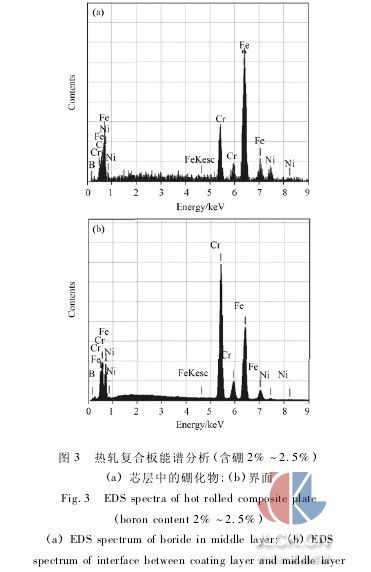 對熱軋后芯層中的硼化物及復(fù)合板界面處進(jìn)行了eds分析,結(jié)果如圖3及表2所示。芯層中硼化物的b含量達(dá)到42.72%,原子分?jǐn)?shù)達(dá)到79.23%,根據(jù)fe-b二元相圖[8],判斷該物相的成分中含有fe2b相。芯層中的硼化物除含有較多的fe 外,還含有一定量的cr、ni。cr元素由于是易形成碳化物的元素,而且具備生成cr-b化合物的熱力學(xué)條件,因此推斷該相中cr的存在形式有兩種: cr的碳化物和cr2b,綜上可知芯層塊狀硼化物的主要成分為: cr的碳化物,fe2b和cr2b。界面處硼含量較低,但cr含量較高,說明界面處的組織仍主要是α-fe基體相,但界面附近存在有少量由芯層越過界面擴散到覆層而形成的二次硼化物。