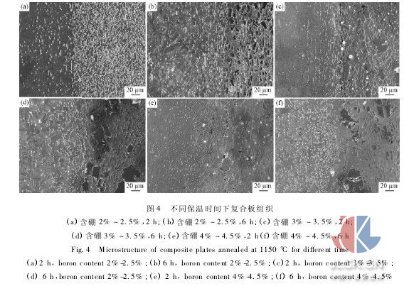 的規(guī)律,但硼化物經(jīng)過初步的粗化以后,在保溫過程中基本是穩(wěn)定存在的。盡管含硼不銹鋼復(fù)合板屏蔽熱中子的性能隨著含硼量的增加而提高,但過高的硼含量使組織中出現(xiàn)難以通過熱軋變形而破碎的大塊狀過共晶組織。因此,從高硼不銹鋼復(fù)合板力學(xué)性能及防氧化考慮,硼含量控制在3%以內(nèi),擴散退火時間控制在2h左右為宜。