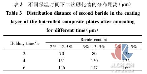 結(jié)合圖4、表3可以看出,隨著芯層硼含量的升高,同樣保溫時間下二次硼化物的分布距離增加,但這種變化的程度并不大。這是由于,一方面,隨著硼含量的增加,芯層中細(xì)小的共晶硼化物以及二次硼化物的數(shù)量是明顯增加的。這些硼化物可能隨著硼原子的擴散,部分溶解到基體中,因此有利于擴散的進(jìn)行。另一方面,過共晶硼化物在保溫過程中基本不會出現(xiàn)局部向基體中溶解的過程。在硼原子從界面向覆層的擴散過程中,基本上不受到中間層組織中的過共晶硼化物的影響。所以,硼原子的擴散速率隨著中間層硼含量的增加而變化的程度不大。